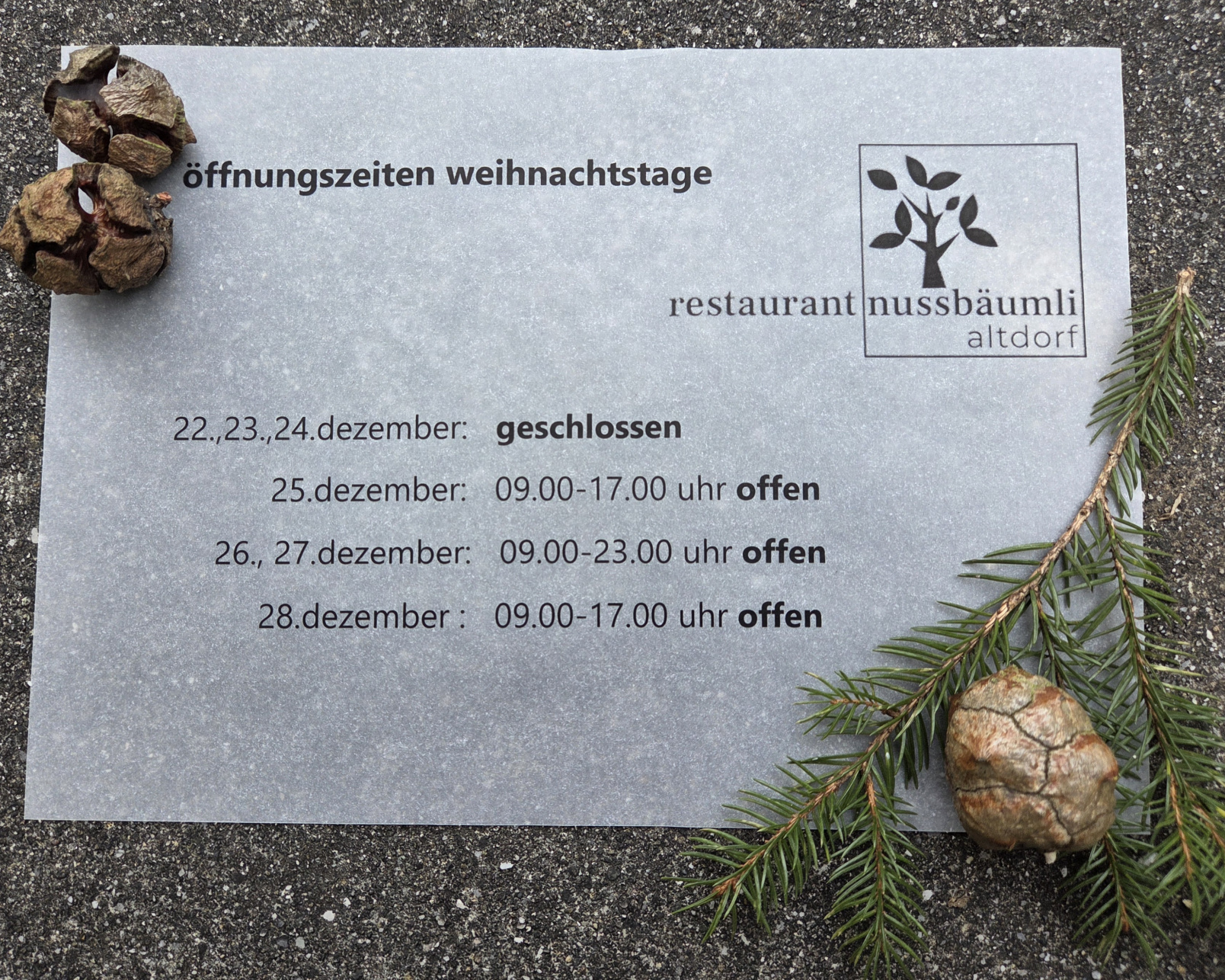 Liebe Gäste, lassen auch Sie sich von diesen Stimmungen und Bildern begeistern und kehren Sie bei uns ein um sich vom Winterwetter beim Spaziergang aufzuwärmen. Ein feines Essen oder einen warmen Glühwein oder Punsch am Fenster mit Aussicht auf das Tal zu geniessen ist den Fussmarsch hinauf ins Nussbäumli alleweil wert.